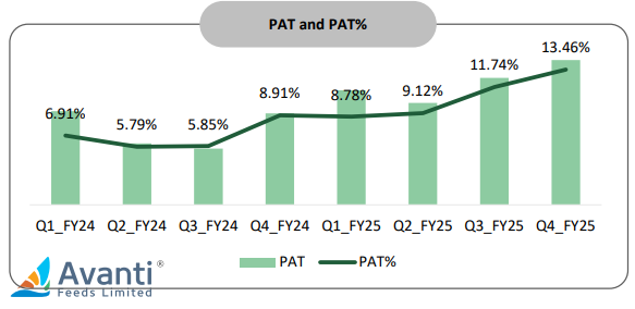 Shrimp feed is Avanti’s cash engine, and in FY25, it benefited from both higher volumes and easing input costs. But the company also has a processing segment, which deals with cleaning, freezing, and exporting shrimp to countries like the US and Japan. This saw higher volumes but lower profitability, thanks to a complicated tariff story.