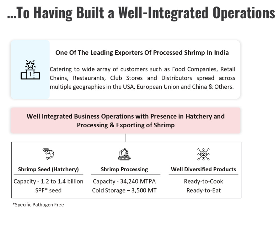 Their facilities, mostly based in Andhra Pradesh, are located close to key shrimp farms and ports like Kakinada and Vizag. They have two processing plants with a total capacity of 34,240 metric tonnes (MTPA), including a growing share of ready-to-eat products.