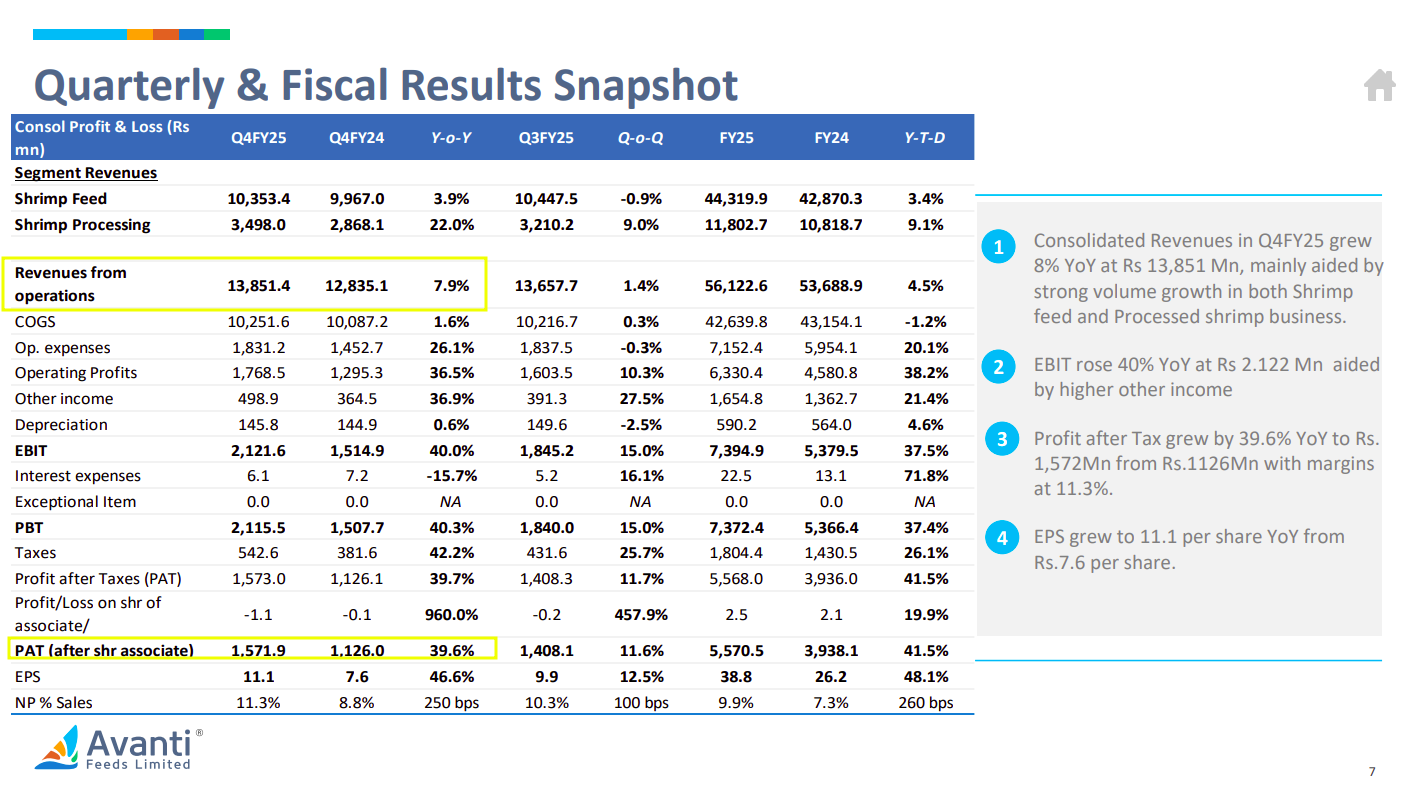 The company started earning more on its sales. Its average shrimp selling price was ₹794/kg, up 20% YoY and 6% QoQ. EU sales, in particular, boomed: shipments to Europe rose 70% YoY in Q4, and now form a solid 39% of annual sales — up from 26% just a year ago.