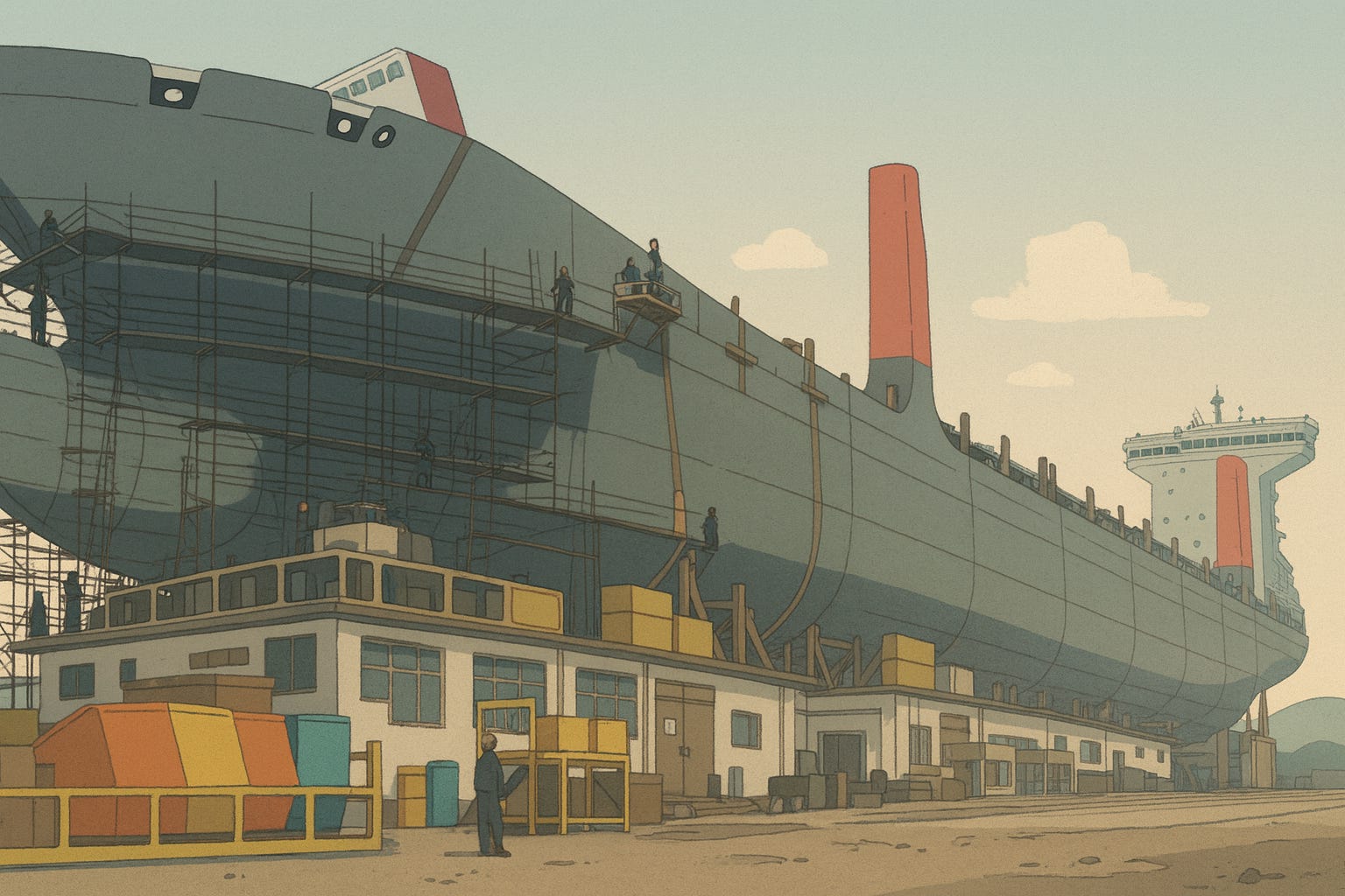 The first is building, which involves taking an order, designing, and assembling a ship from scratch. The second is repair and maintenance: keeping ships seaworthy through their 20–30 year lives, including mandatory surveys, overhauls, and retrofits. And the third is recycling: what the industry politely calls “breaking,” where old ships are dismantled and their steel is sold back into the market. Think of it as a life cycle: build, operate, repair, recycle.