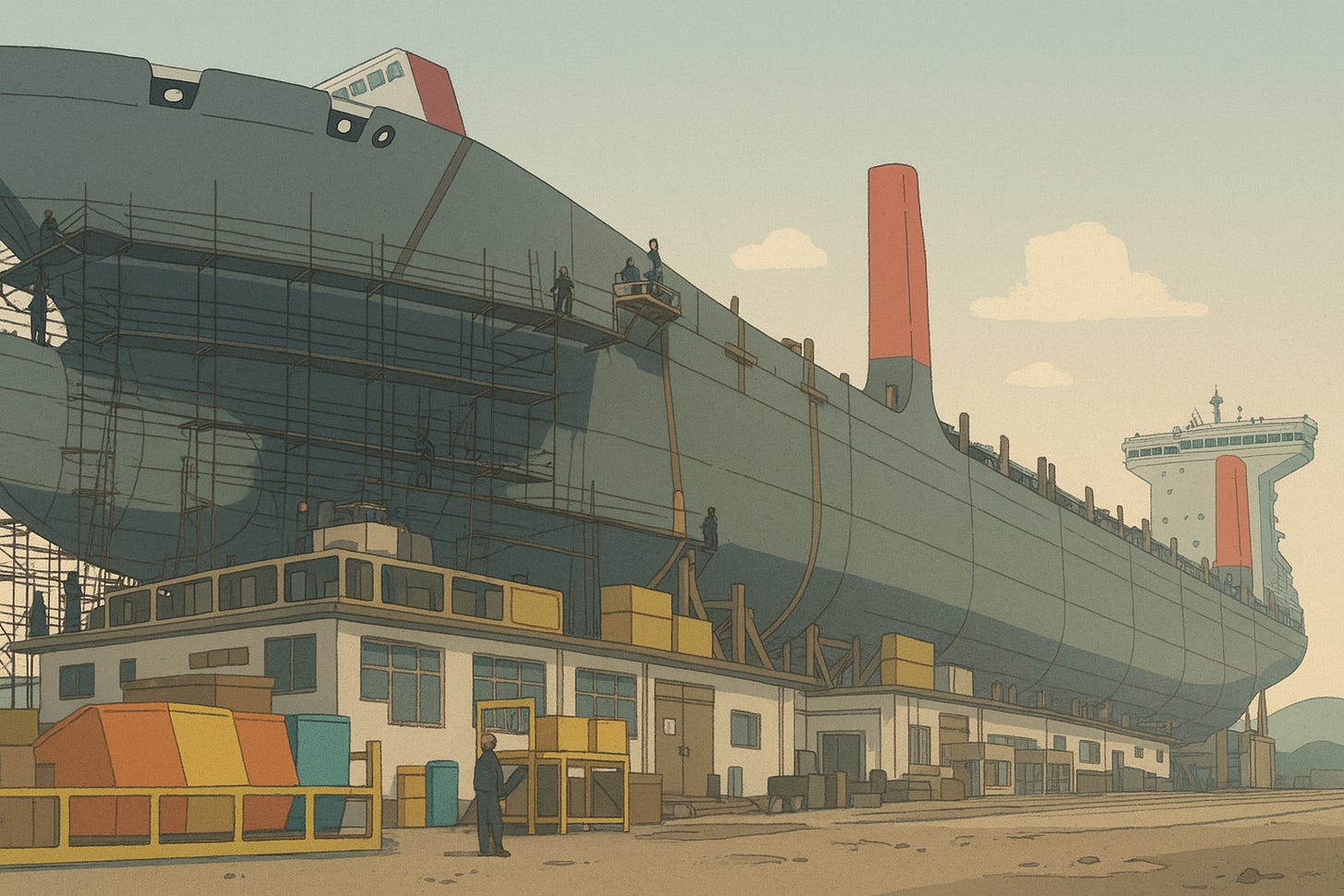 A striking feature of the industry is that it’s incredibly concentrated, with 3 countries making up over 90% of the world’s ships. China makes up ~53% of the market, South Korea follows with 28%, and Japan holds ~12%. Everyone else combined—including the U.S., Europe (outside of cruise ships), and India—hardly have any share. And it wasn’t always this way; 20 years ago, Japan was on top. But with aggressive state policy, patient capital, and a relentless push for scale, China leapfrogged to #1.