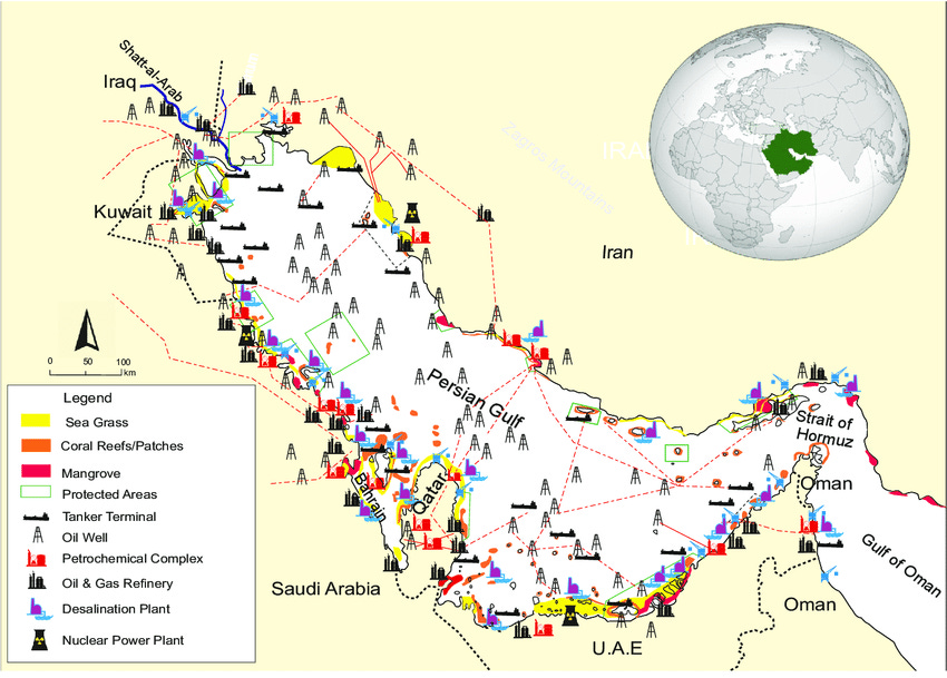The region’s smaller countries have almost no way of by-passing the Gulf. All the oil from Iraq, Kuwait and Qatar exclusively goes through the Persian Gulf.