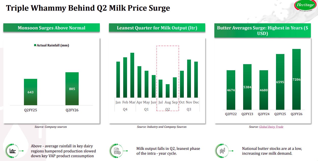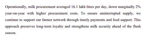 Now, the second quarter of any year is usually a lean season for milk production. Cows produce less milk in the summer and monsoon months. Meanwhile farmers take the benefit of the rains to grow more fodder to feed their cattle, ahead of the flush season which starts from the third quarter. So, in Q2, demand naturally outpaces supply, leading to higher milk prices.