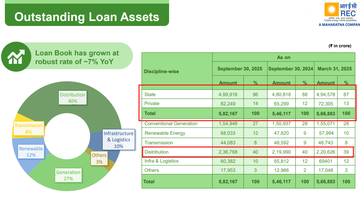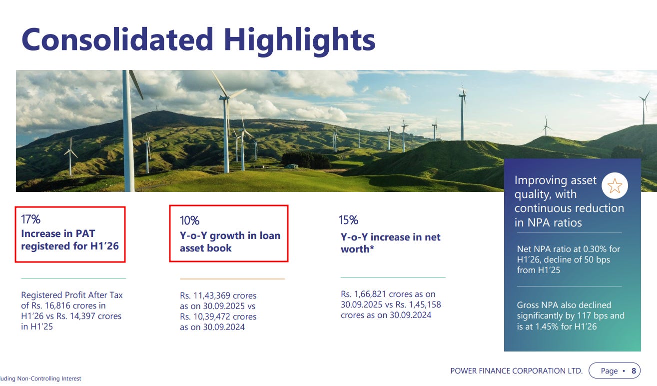 PFC just delivered solid results. In the first half of FY26, its consolidated profit after tax was a best-ever ₹16,816 crore, up 17% from last year. Its loan book expanded to ~₹11.43 lakh crore — roughly 10% up year-on-year — by the close of Sept 2025. Behind this growth was the funding it gave to renewable energy projects, as well as its large disbursements to distribution companies under schemes like RDSS.
