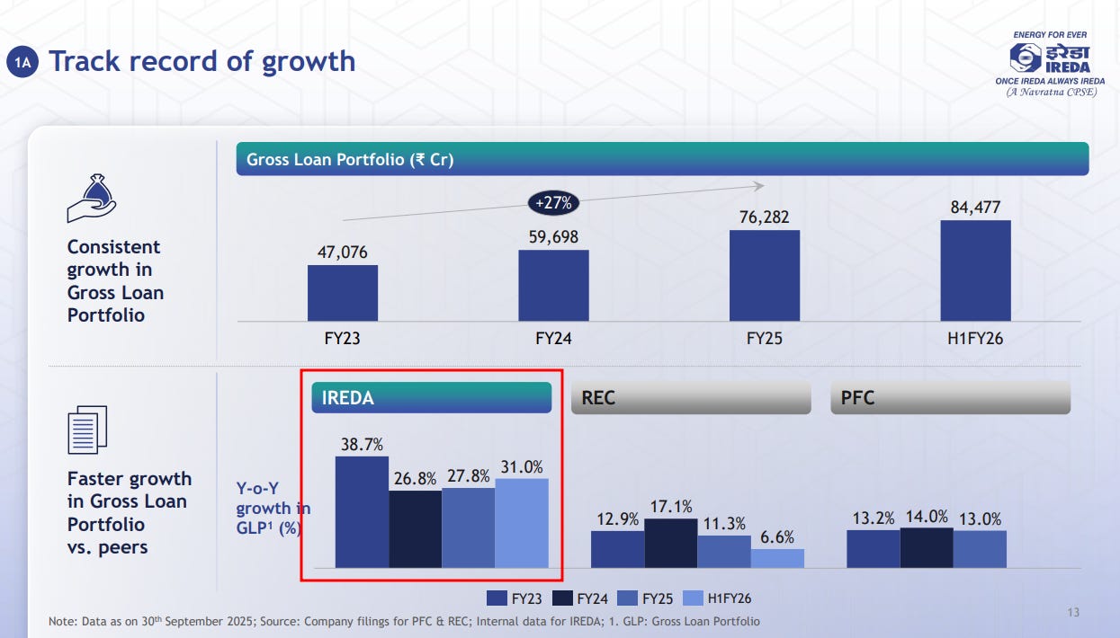 As India transitions its electricity mix, IREDA is growing rapidly. Its loan book stood at ₹84,477 crore at the close of September 2025 — a whopping 31% higher than a year ago. With this larger book, along with stable interest spreads, its operating profit jumped ~52% year-on-year. This makes it the fastest growing of the three power IFCs in discussion.