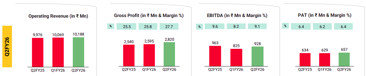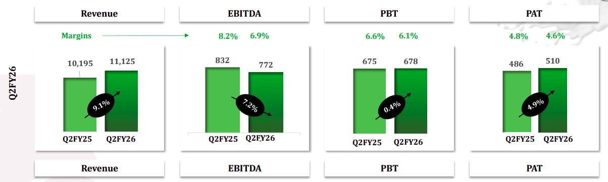 Dodla Dairy sits somewhat in between these two. Its revenue grew at a modest 2.1% y-o-y, to ₹1,019 crore. Last year’s revenue figures, however, included ₹165 crore in bulk commodity sales that Dodla intentionally curtailed. Excluding those low-margin bulk trades, the company’s underlying revenue growth was actually 13%. PAT was up 4% to ~₹66 crore.
