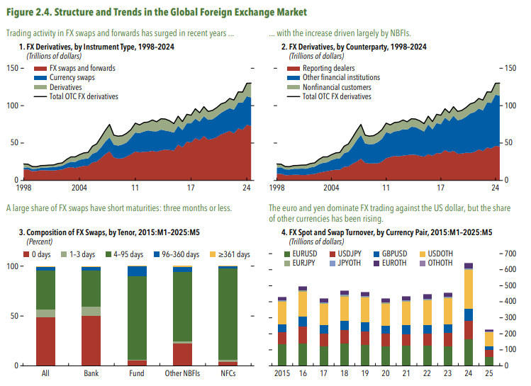 First, there’s been a massive shift in who’s trading currencies. The market used to be dominated by big banks. But over the past decade, non-bank financial institutions (or NBFIs) — which include hedge funds, asset managers, and proprietary trading firms — have become much bigger players. These NBFIs primarily deal in short-term derivative instruments like FX swaps and forwards, which now dominate trading volumes.