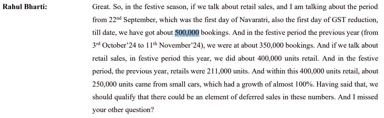 The numbers tell the story of a sharp turn. In the festive period — starting 22nd September, the same day the GST cut kicked in — Maruti recorded about 500,000 bookings, compared to 350,000 the previous year. Retail sales nearly doubled, from 211,000 units a year ago to around 400,000 this time. Of those, roughly 250,000 units came from small cars, a growth of almost 100%.