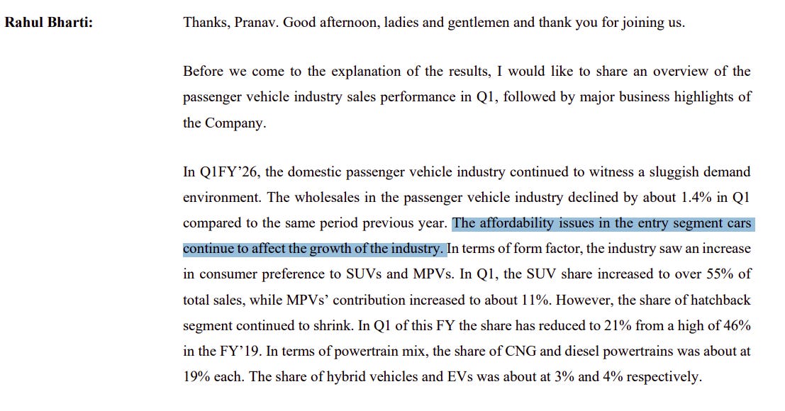 For a company built on small cars, it almost felt like Maruti had stopped believing in them. For a while, they’d been saying the same thing — that affordability had collapsed, that the middle class had stalled, that first-time buyers weren’t coming back. So when small cars suddenly started moving again, it wasn’t just demand reviving. It was Maruti rediscovering its own audience. The GST cut in September helped, of course. It made the numbers line up again for people who’d been priced out. But the bigger shift was emotional: the company that had written off the bottom of the market was now seeing it come back to life right in front of them