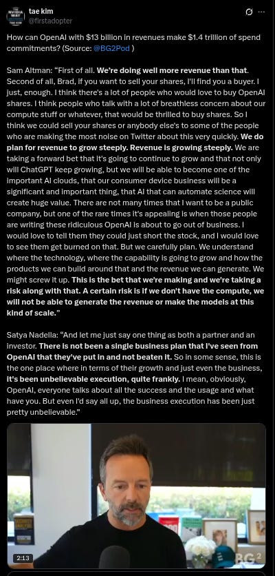 And, the best one out of this week was when Sam Altman went on a podcast with Brad Gerstner, who’s an investor in OpenAI and Satya Nadella. Brad asked him the blunt question that everyone has been talking about for the longest time: