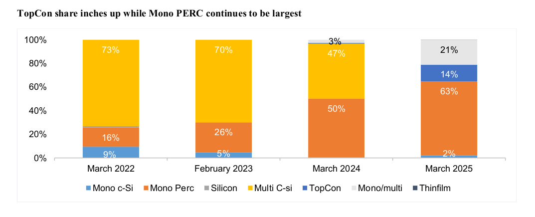 Until recently, multi-crystalline silicon cells dominated the market. They were relatively cheap to produce, but could only convert 15-17% of the sunlight hitting them into usable electricity. However, as the industry matured, efficiency became paramount. In just a few years, multi-crystalline cells have virtually disappeared from the Indian market, dropping from 73% market share in March 2022 to almost nothing by 2025.