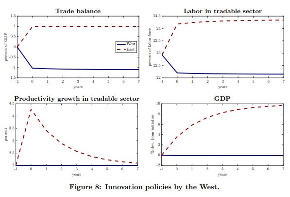 The paper’s simulations show that with well-targeted innovation policies, a deficit country can actually benefit from the trade surplus of the other — enjoying cheap goods and cheap credit while maintaining its own innovation engine. A win-win is indeed possible.