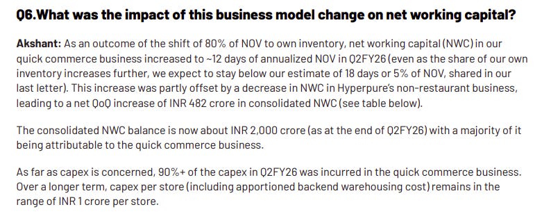 Back in Q1, Akshant had said this would increase. At full scale, they expected roughly eighteen days of working capital, or about five percent of net order value. But the company also made a point that not all inventory-heavy models are the same. The way Blinkit holds and moves stock is very different from how a supermarket does it.