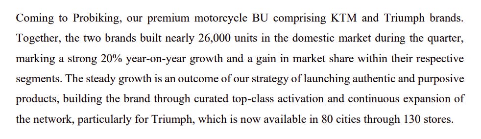 In India, KTM lives inside Bajaj’s Probiking division, the same one that runs Triumph. It’s not Bajaj’s biggest business by revenue, but it’s important: it brings technology, exports, and a bit of global sheen. Last quarter, Bajaj sold around 26,000 KTMs and Triumphs in India about 20% more than a year ago and crucially, restarted KTM exports that had been frozen for months.