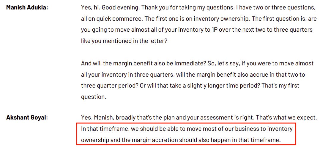 Last quarter, Blinkit’s management spoke about what they called a structural shift in their business. They were moving from a marketplace model, where other sellers list and sell on the platform, to an inventory-led model where Blinkit owns what it sells.