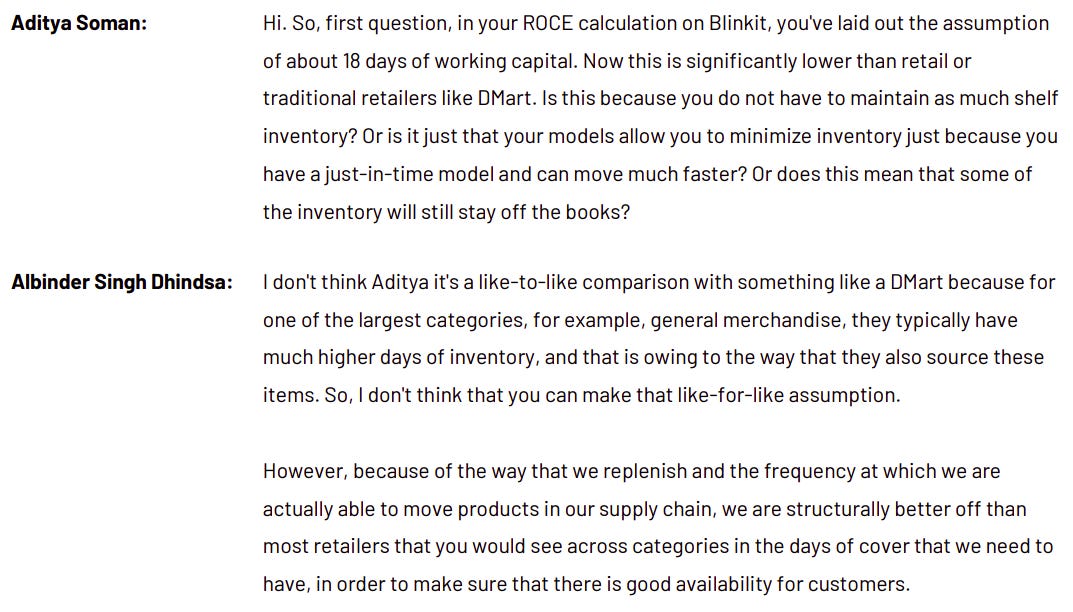 On the concall, when an analyst compared Blinkit to DMart, Albinder explained why that comparison doesn’t really hold. A retailer like DMart carries big, slow-moving categories — general merchandise, home goods, electronics — items that can sit on shelves for weeks. Blinkit, on the other hand, deals mostly in groceries and daily-use items that move much faster. Stock comes in and goes out several times a week. Because of that speed, the amount of inventory Blinkit needs to keep at any given time is far smaller.
