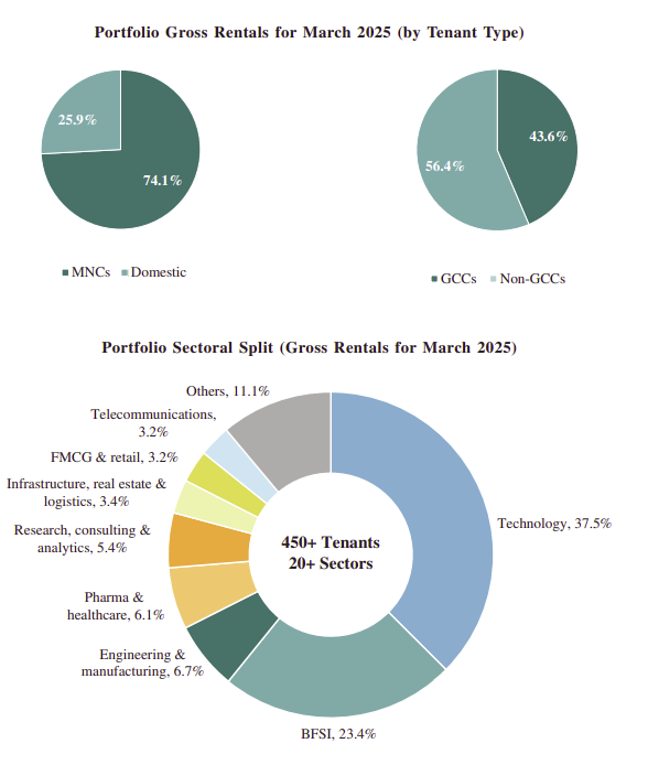 As of March 2025, Knowledge had a committed occupancy of 91.4% — solid but not maxed out. And ten of its tenants account for 28.4% of its rentals. For comparison, Embassy Office Parks REIT has 37.4% of its gross rental coming from the top 10. So there’s a little concentration risk here — if even one major tenant leaves, it could hurt cash flows meaningfully. But it’s not that bad.