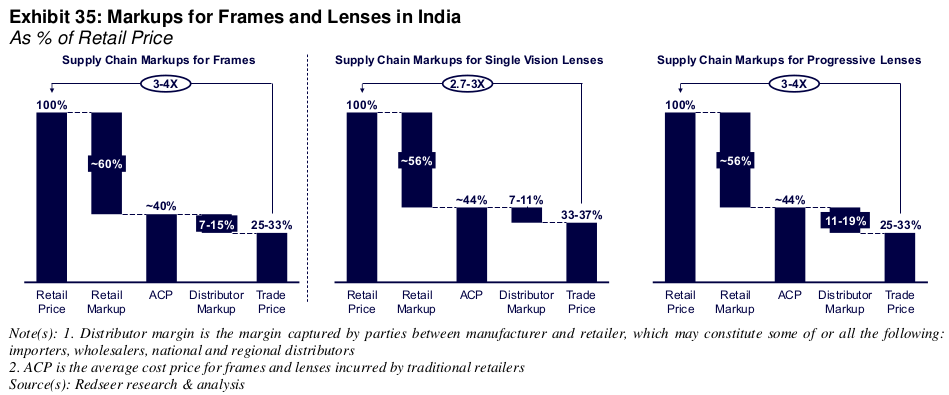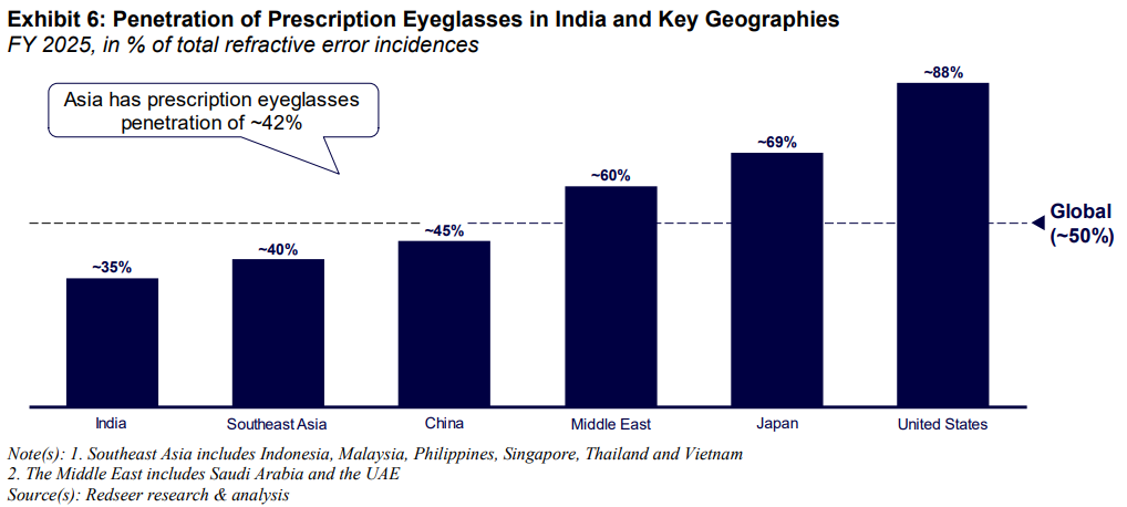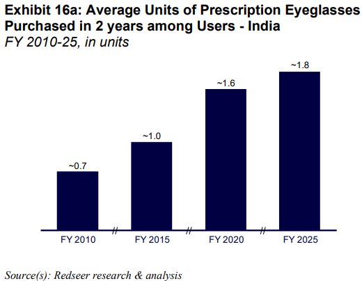 According to Redseer, in just the coming five years, the prevalence of eye problems will increase even further — by then, 166 million additional Indians will need glasses. At the same time, eyeglass penetration will grow, from 35% to 41%. That is, in just five years, roughly 111 million more people will regularly wear glasses. There is, in short, a lot of fresh demand to unlock.