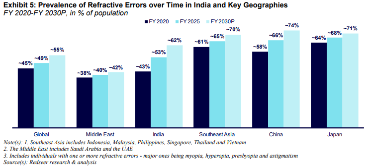 Around the world, more and more people need glasses each year. That’s partly just because populations are aging all over the world. But it’s also because our lifestyles are getting worse: we’re staring at screens too much, sleeping too little, and are living amidst too much pollution. Because of this, our eyes have become worse than they have ever been. In India, for instance, in just the five years between FY 2020 and FY 2025, the prevalence of eye issues has gone from 43% to 53% of the population.
