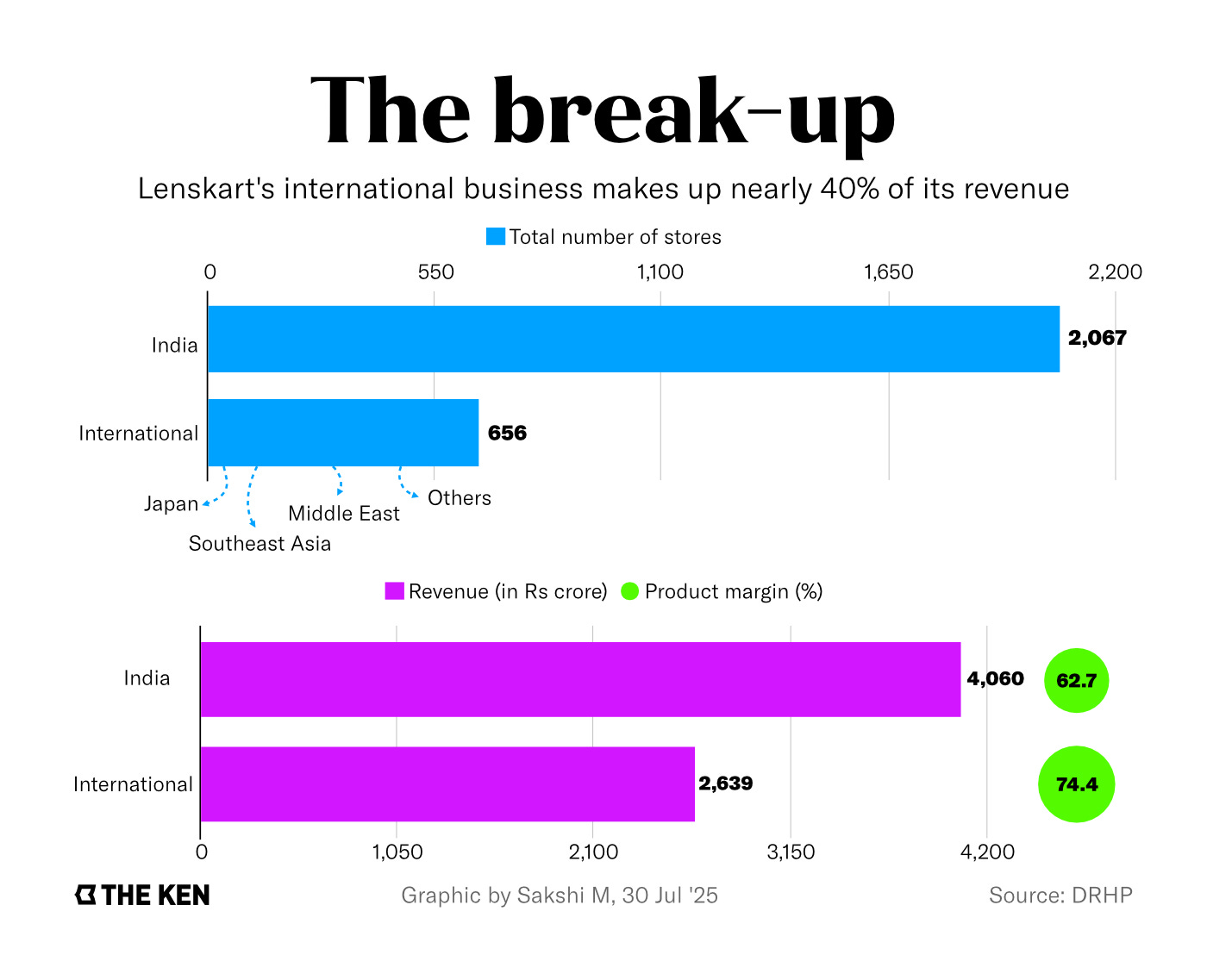 International expansion: Lenskart is slowly expanding abroad. It’s not rushing this either — it has chosen specific markets, like UAE, Singapore and Japan, which work somewhat like the Indian market. Foreign markets are less price conscious than India — and give the company better margins. Its gross margins abroad are ~74%, compared to ~63% in India. And so, foreign markets are already making for a decent portion of its revenue.