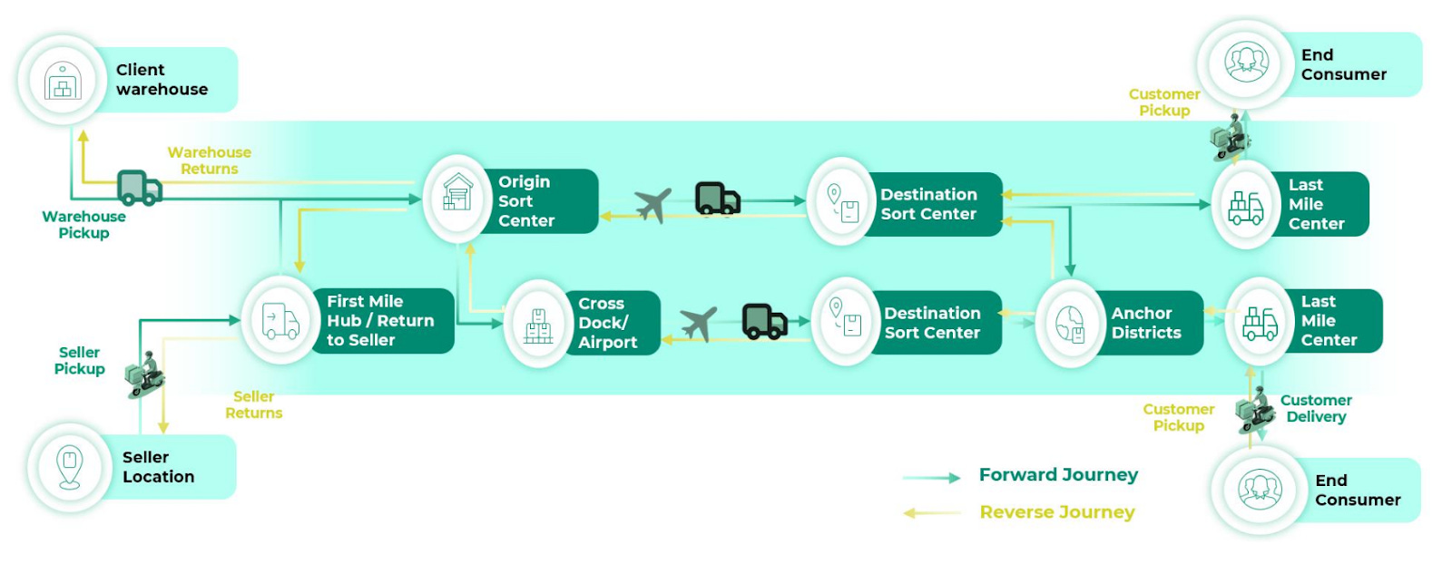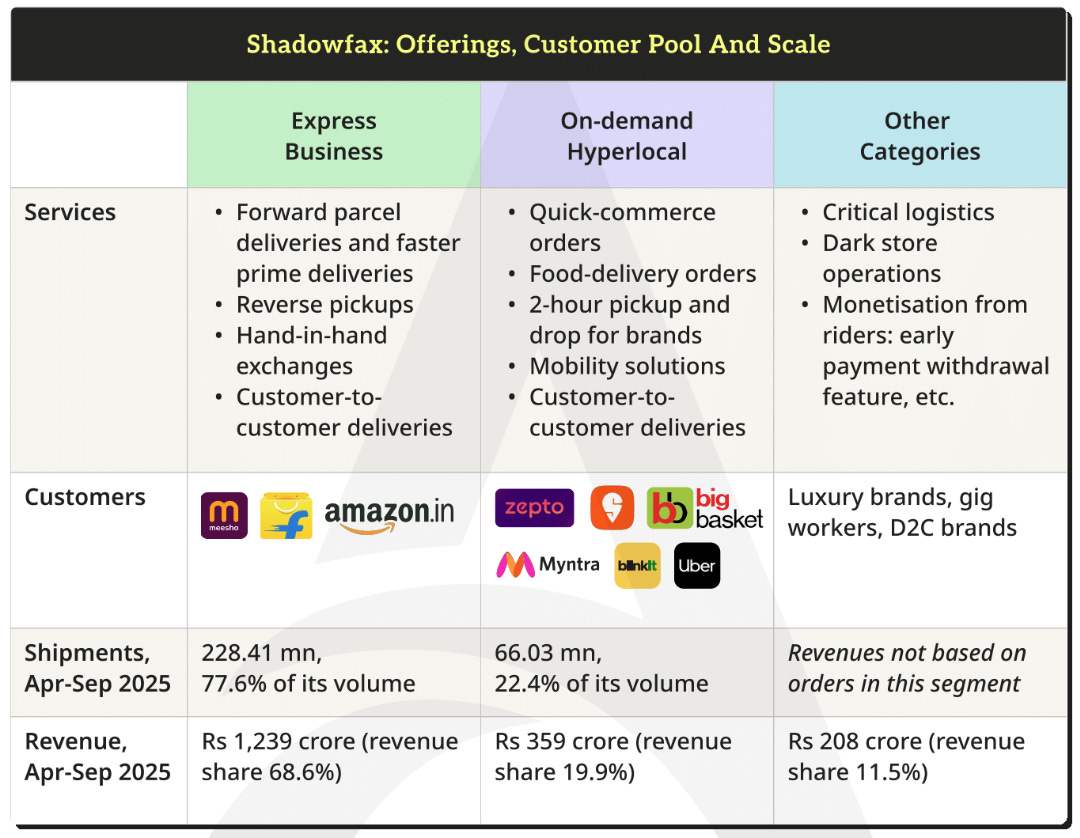 The first, e-commerce, is standard parcel delivery — picking up packages from warehouses and taking them to customers, usually within 1–3 days. ~70% of Shadowfax’s revenue comes from this business-line, where it handles everything from routine deliveries to returns. It serves major online shopping platforms, like Meesho and Flipkart, as well as direct-to-consumer brands.