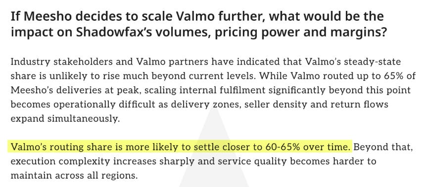 But even if that’s true, Shadowfax needs to watch its back. Meesho doesn’t have to go “fully in-house” to hurt Shadowfax. Even a partial reallocation can carve into Shadowfax’s thin margins.
