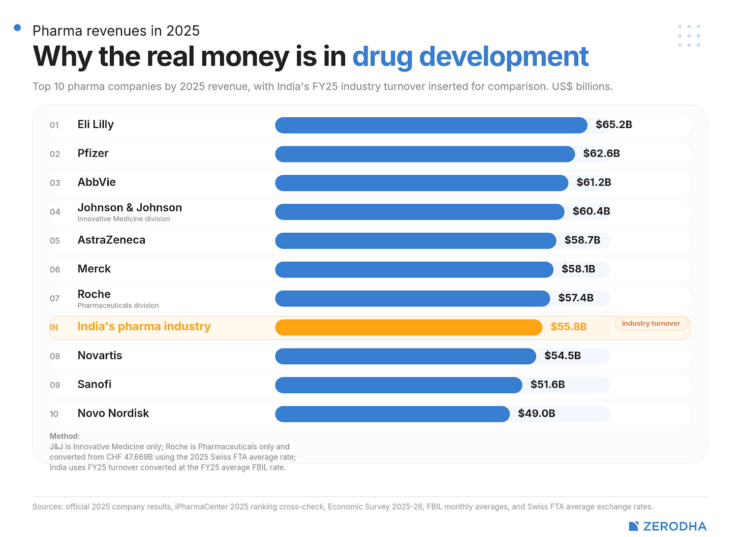 For now, this fact might have helped us somewhat escape a geoeconomic threat. But it also points to a ceiling. The entire Indian pharmaceutical industry earned $55 billion last year. Merck, a single pharmaceutical innovator, made $58 billion in pharma sales around the same time. That’s the difference between manufacturing a drug and developing one.