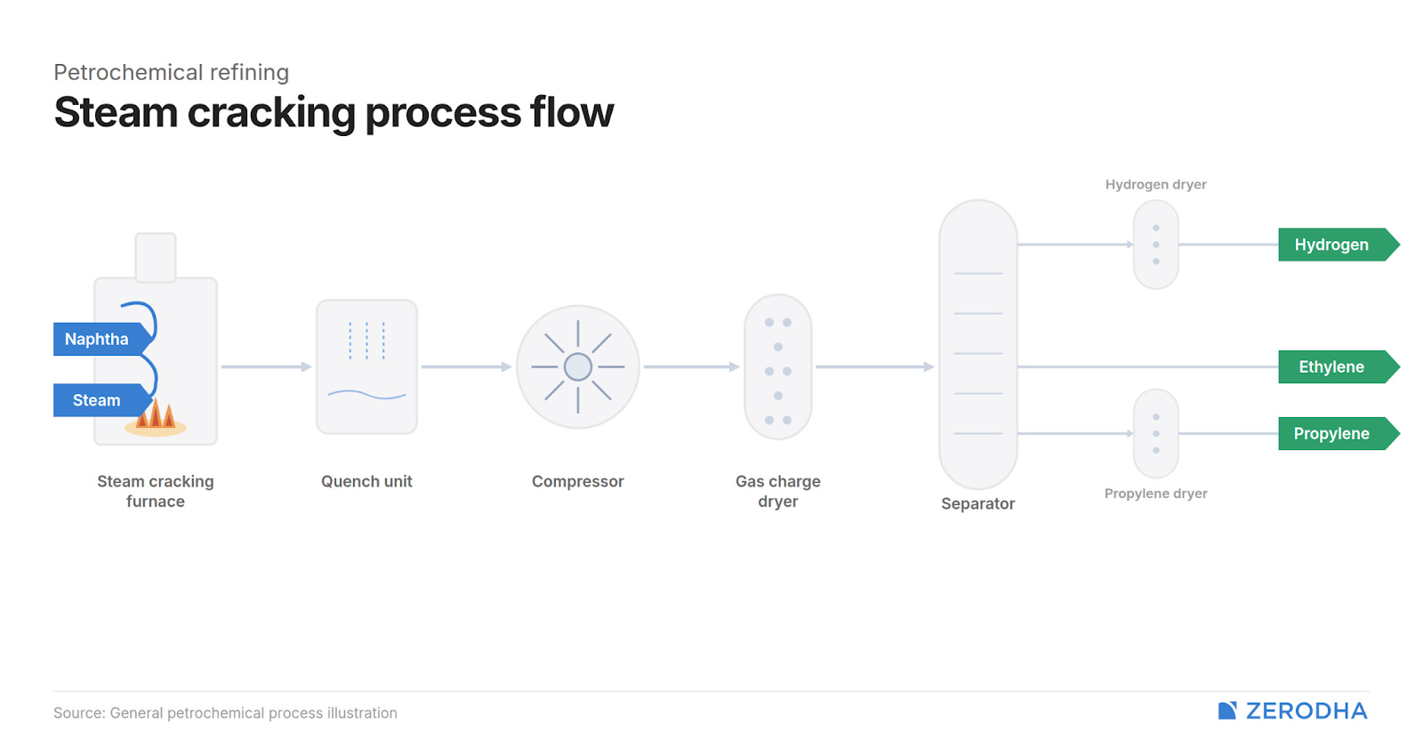 The industrial heart of this process is the steam cracker — one of the most energy-intensive machines on earth. Here, naphtha is mixed with steam and blasted through reactors at 800-870°C for mere milliseconds, then quenched instantly to freeze the output. This thermal shock breaks apart the heavier hydrocarbon chains in naphtha into ethylene, propylene, and butadiene. A single world-scale naphtha cracker needs roughly 3.3 tonnes of naphtha to produce 1 tonne of ethylene.