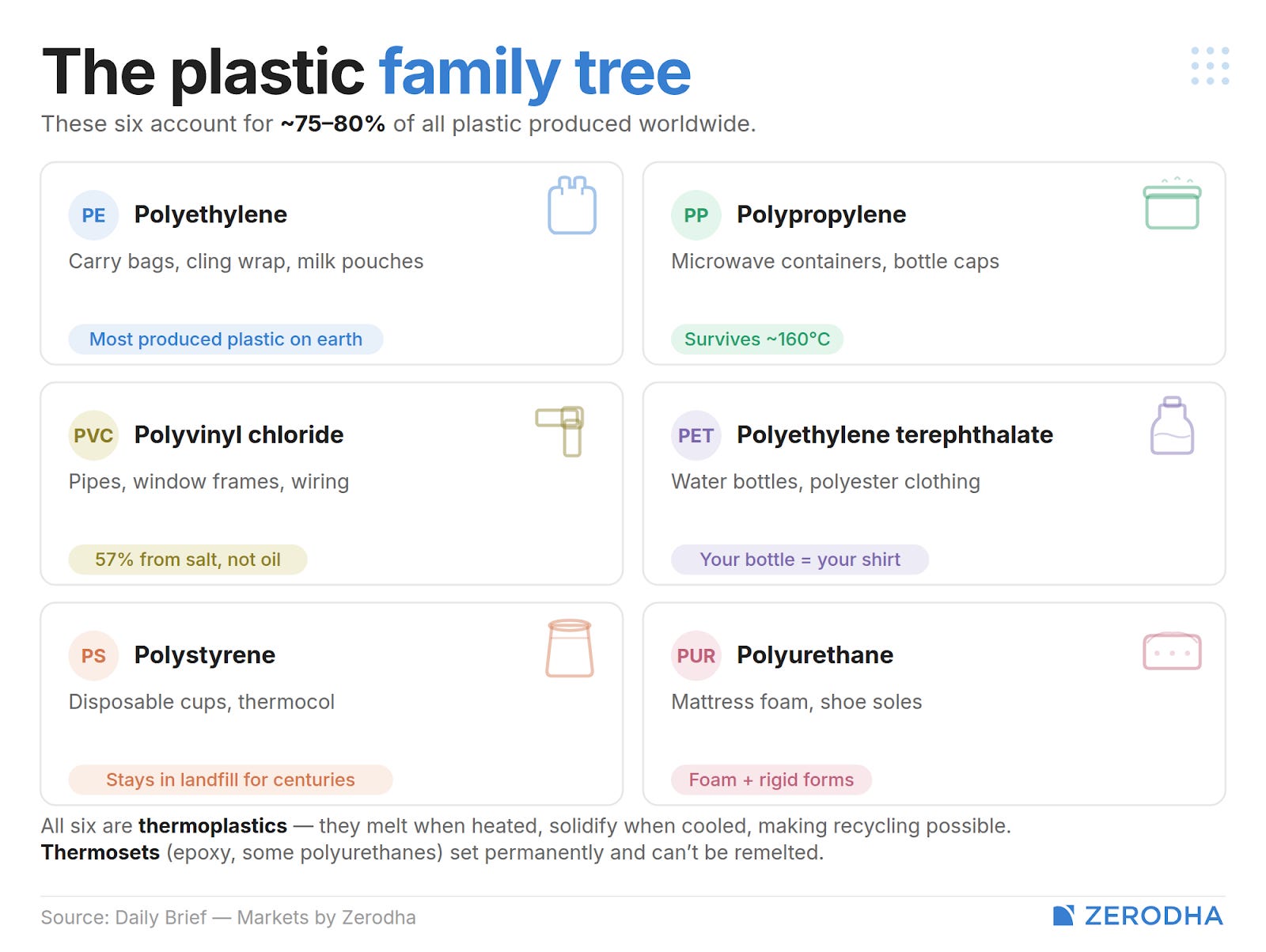 The carry bag, the milk pouch from this morning — that’s polyethylene (PE), the most produced plastic on earth. The food container you just microwaved lunch in uses heat-resistant polypropylene (PP). The pipes carrying water, window frames, wiring insulation in your building comes from PVC. You’re probably familiar with PET, used commonly in water bottles. Melt that and spin it into fibre, and it becomes polyester — your “plastic” bottle and your “polyester” shirt are, at a molecular level, the same thing. The disposable cup from the chai stall, the thermocol around your new TV — that’s polystyrene.