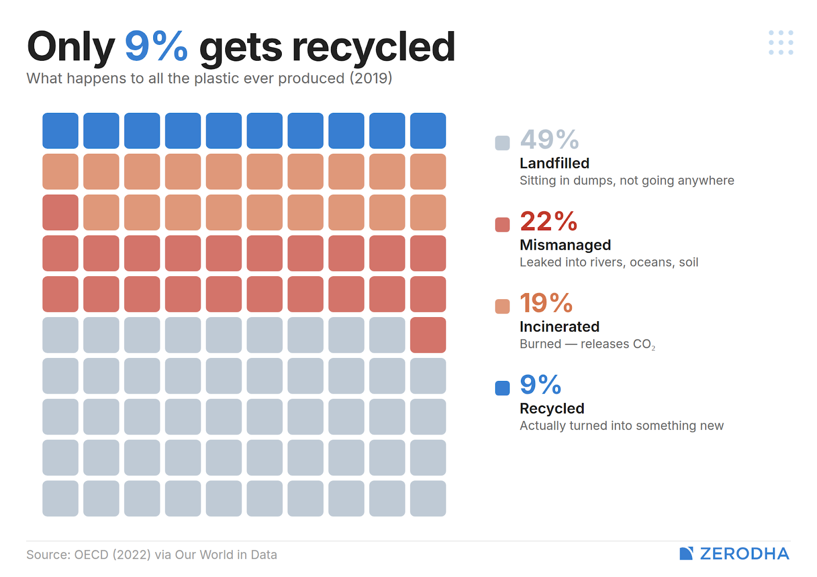 Only 9% of all plastic ever produced has been recycled, while 71% has accumulated in landfills or the natural environment. And more than half of all plastic ever made was produced in just the last two decades. We are early in this accumulation curve.