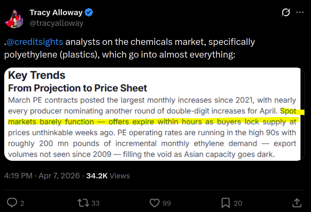 Since the Hormuz crisis began, we’ve been tracking what’s happening to oil. Crude at $120, LPG shortages, the IEA releasing 400 million barrels from strategic reserves. But one downstream effect that hasn’t gotten enough attention is what’s happening to plastics.