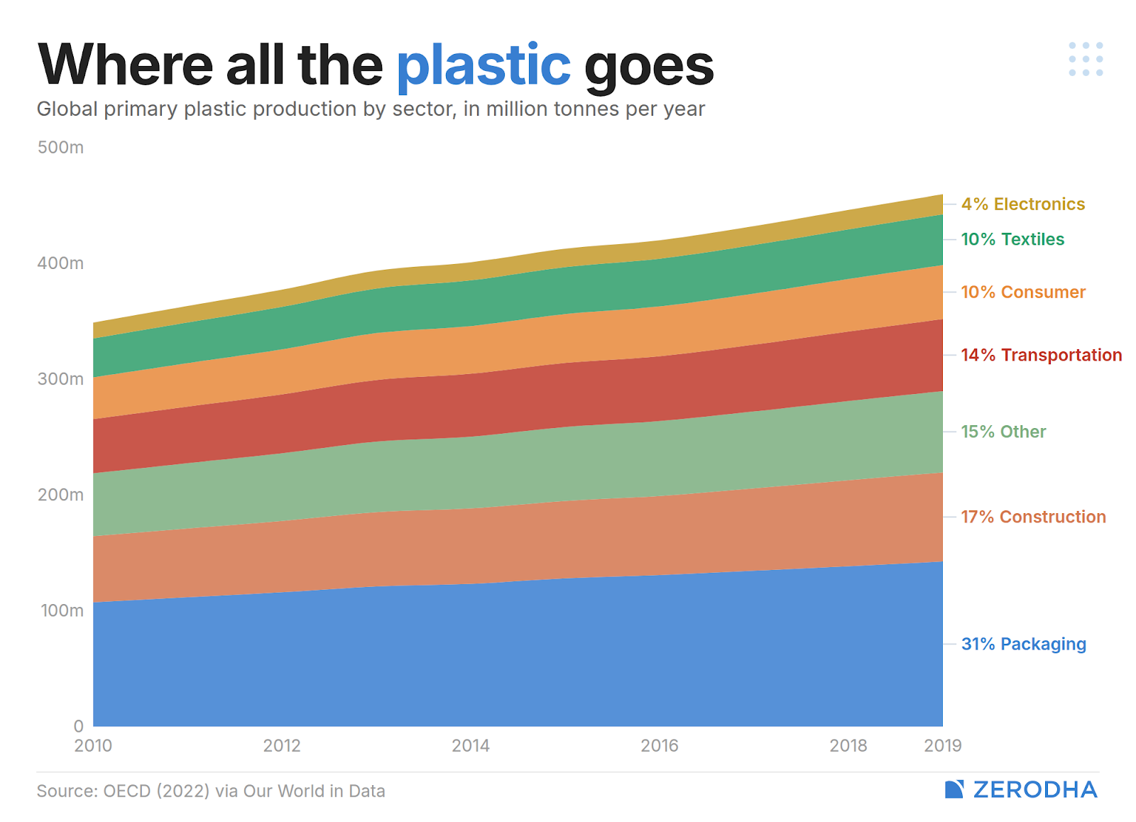 The demand side, meanwhile, is enormous and growing. Packaging consumes over 30% of all plastic produced. Construction takes roughly 20%, driven by government infrastructure pushes. Automotive accounts for about 15%.