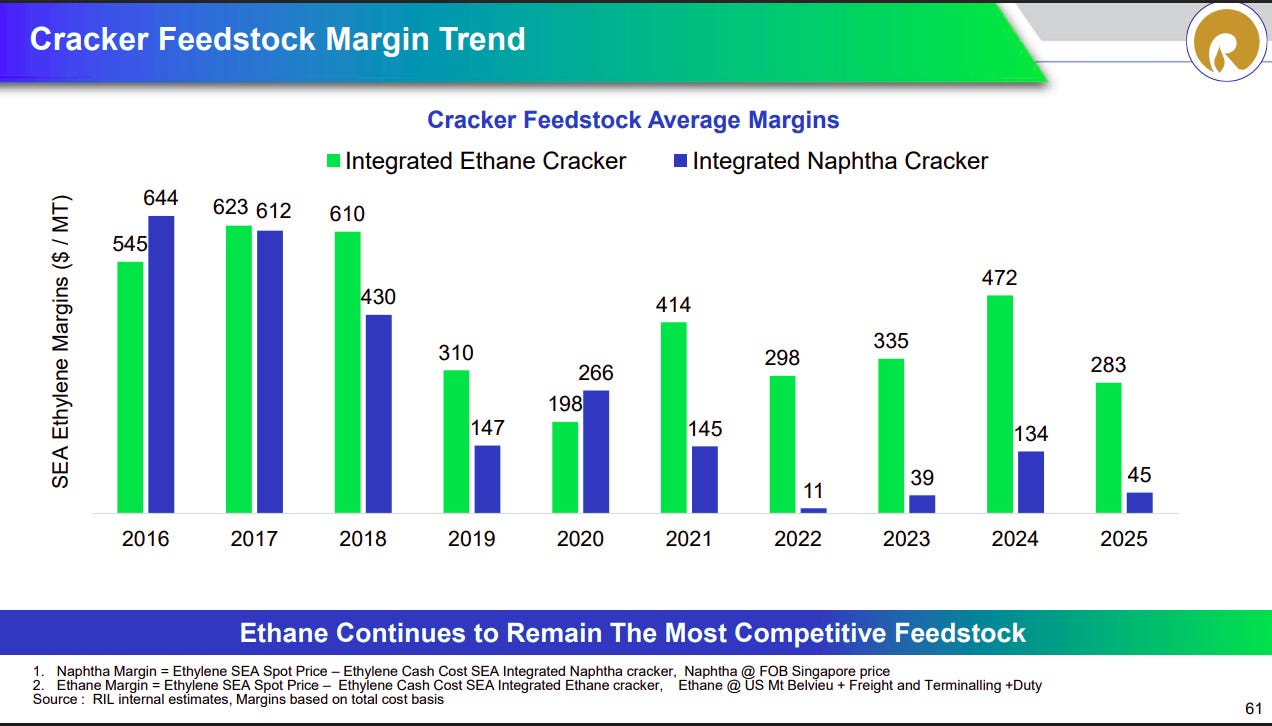 Naphtha isn’t the only way to get ethylene, though. You can also crack ethane, which is a byproduct of natural gas. An ethane cracker is more efficient — a ton of ethylene only needs 1.3 tonnes of ethane. Over the last 15 years, the US shale revolution flooded America with cheap domestic natural gas, and with it, cheap ethane. American petrochemical firms rebuilt their entire infrastructure around this feedstock — extracted from American soil, with no tanker, no ocean, and no external chokepoint.