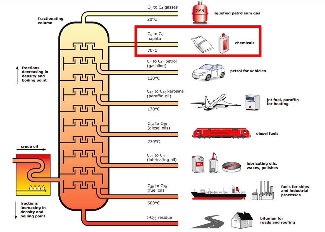 But hydrocarbons turned out to be spectacularly convenient. Oil refineries were already producing naphtha as a byproduct of making petrol and diesel. We went into the details of it in our oil primer.
