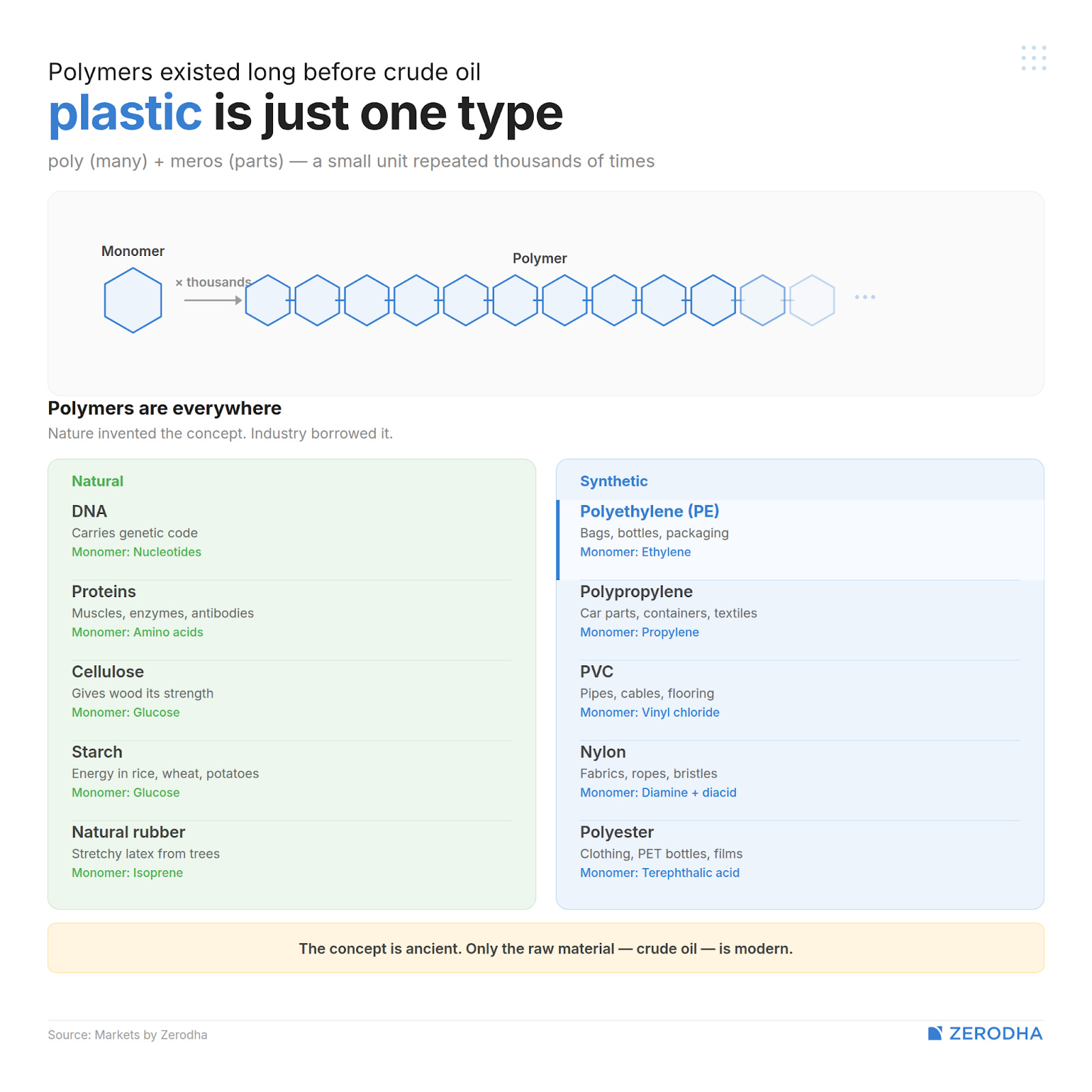 Plastic is a type of polymer. But so is DNA. So is protein. So is the cellulose that gives a tree trunk its strength. The concept of a polymer is one of the most fundamental structural ideas in the universe — and it existed long before anyone drilled for crude oil.
