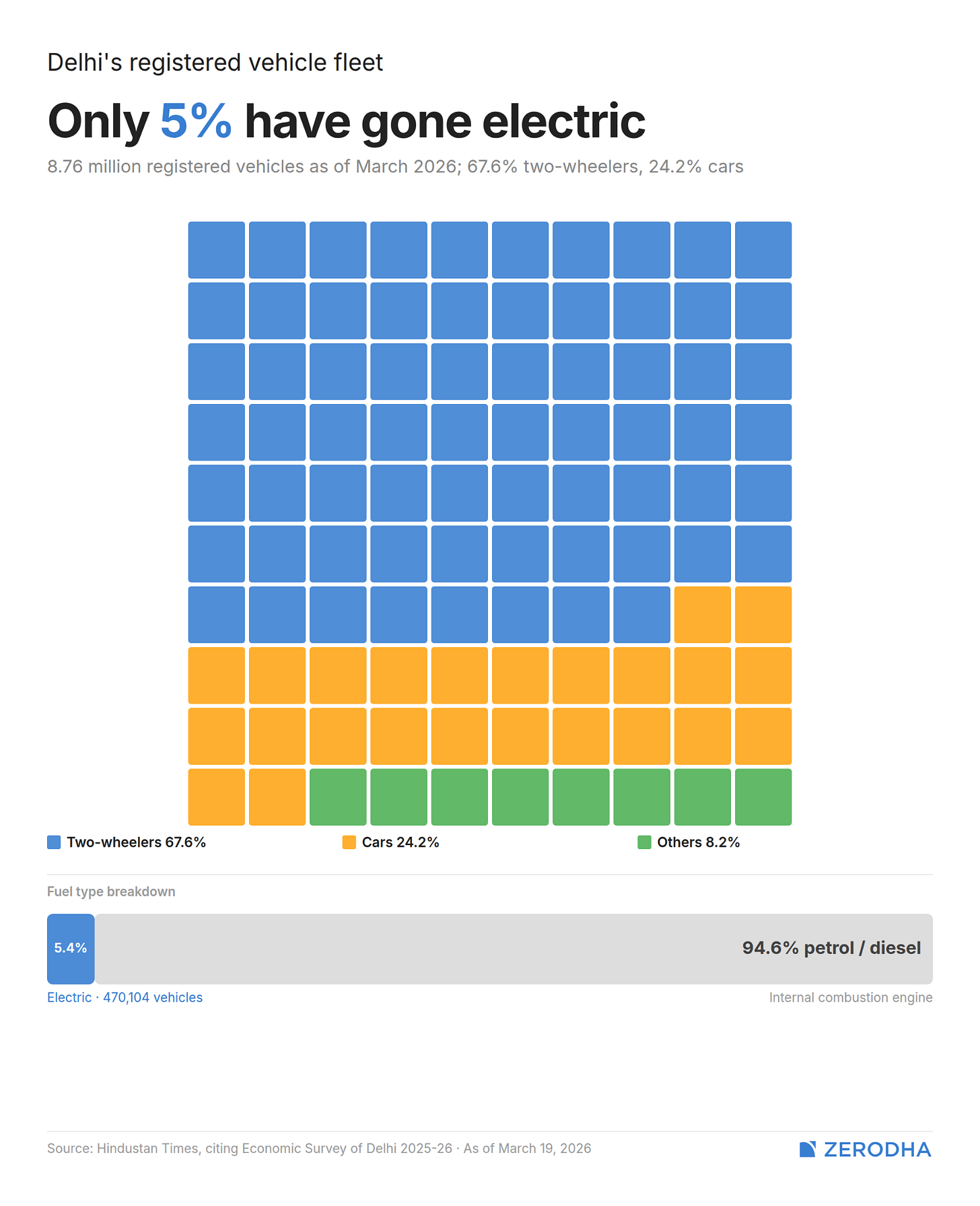 After all, petrol and petrol-ethanol vehicles still held ~73% of new registrations in FY26. In the overall stock, ~95% of Delhi’s vehicles are non-EV.