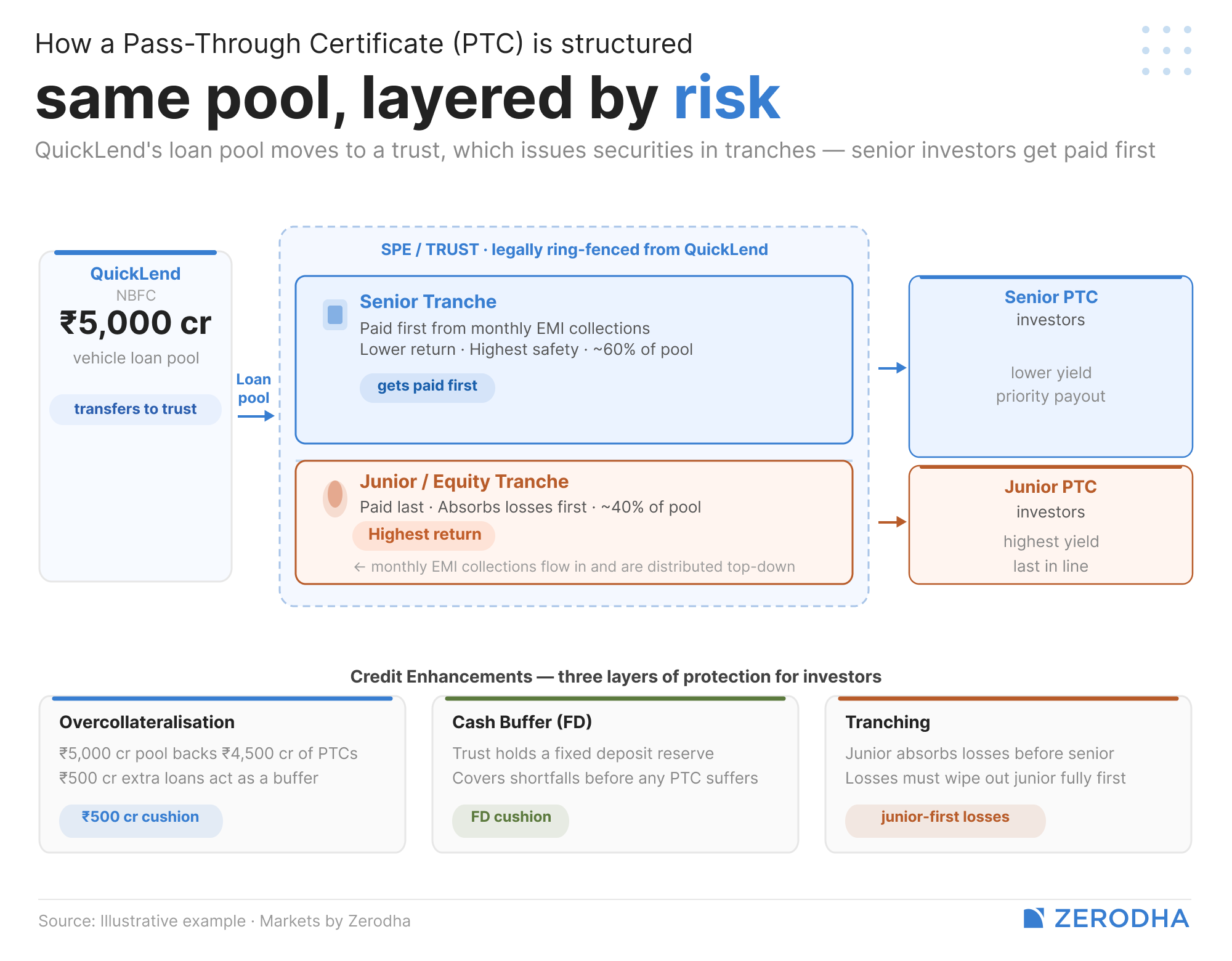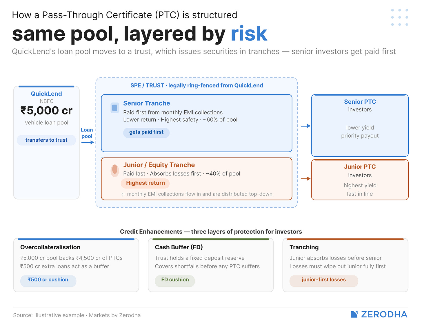 On top of this, the trust holds a cash buffer — a fixed deposit that acts as a cushion. And the loan pool is deliberately made larger than the securities issued against it. Remember QuickLend’s ₹500 crore vehicle loan pool? The trust might issue only ₹450 crore worth of PTCs against it. That extra ₹50 crore of loans is called overcollateralisation — it means that even if a bunch of borrowers stop paying, the remaining pool is still large enough to cover what investors are owed.