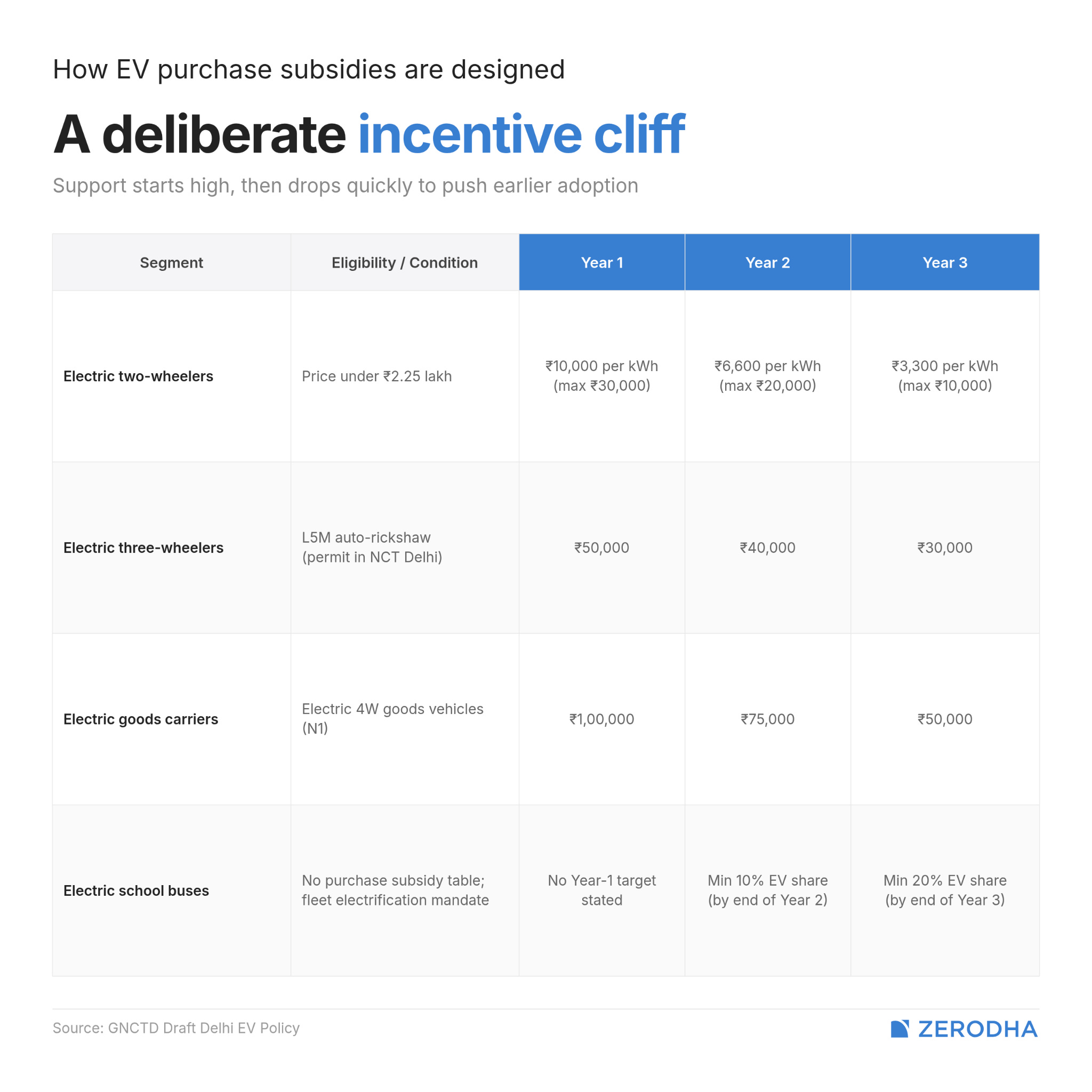A similar logic repeats across segments. Electric three-wheelers, for instance, get ₹50,000 in Year 1, tapering to ₹30,000 by Year 3. Goods carriers see the highest support, up to ₹1 lakh in the first year. The draft even targets school buses. Vehicles that run the most kilometres clearly get steeper slopes.