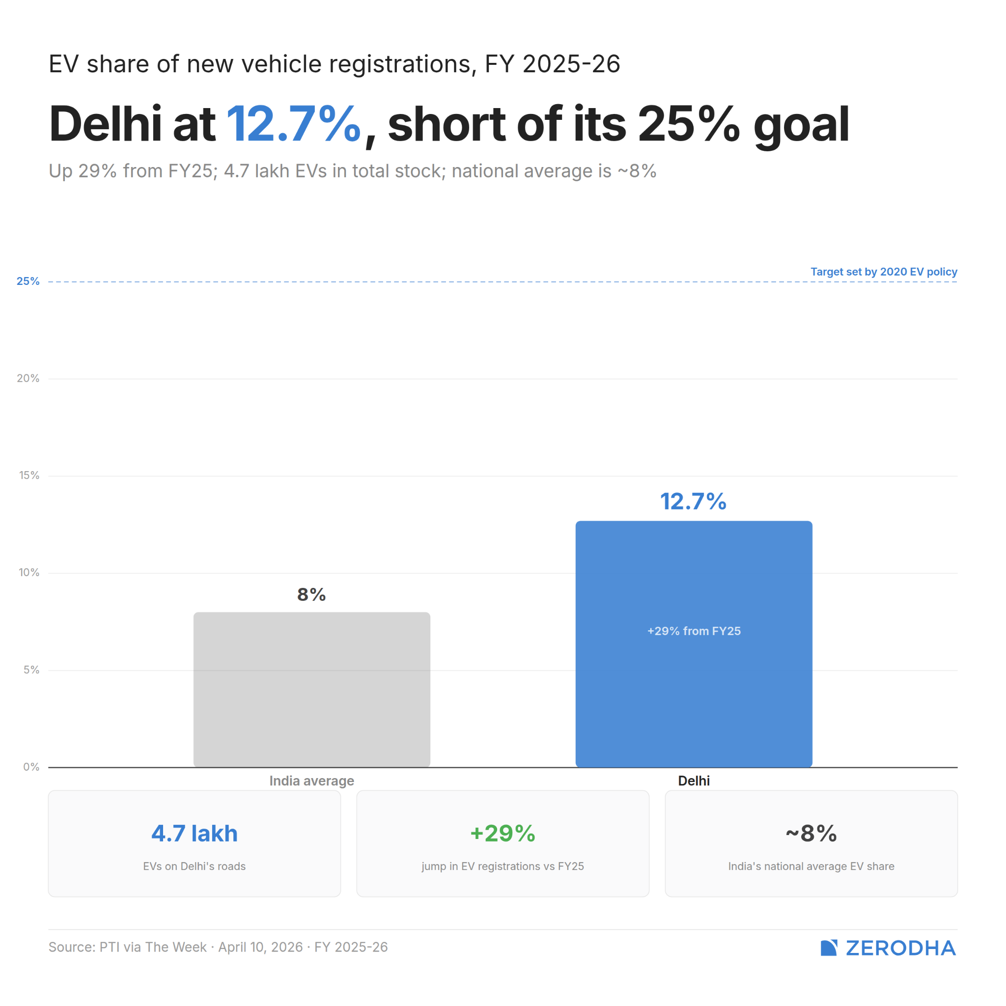 Since then, Delhi has 4.7 lakh registered EVs — about 5.4% of its total vehicle stock. EVs accounted for about 12.7% of new vehicle registrations in FY 2025–26. That’s a 29% jump in absolute numbers from the previous year, and well above the national average of around 8%. The city also consumes more electricity at public charging stations than any other state, and roughly a quarter of national public charging consumption.