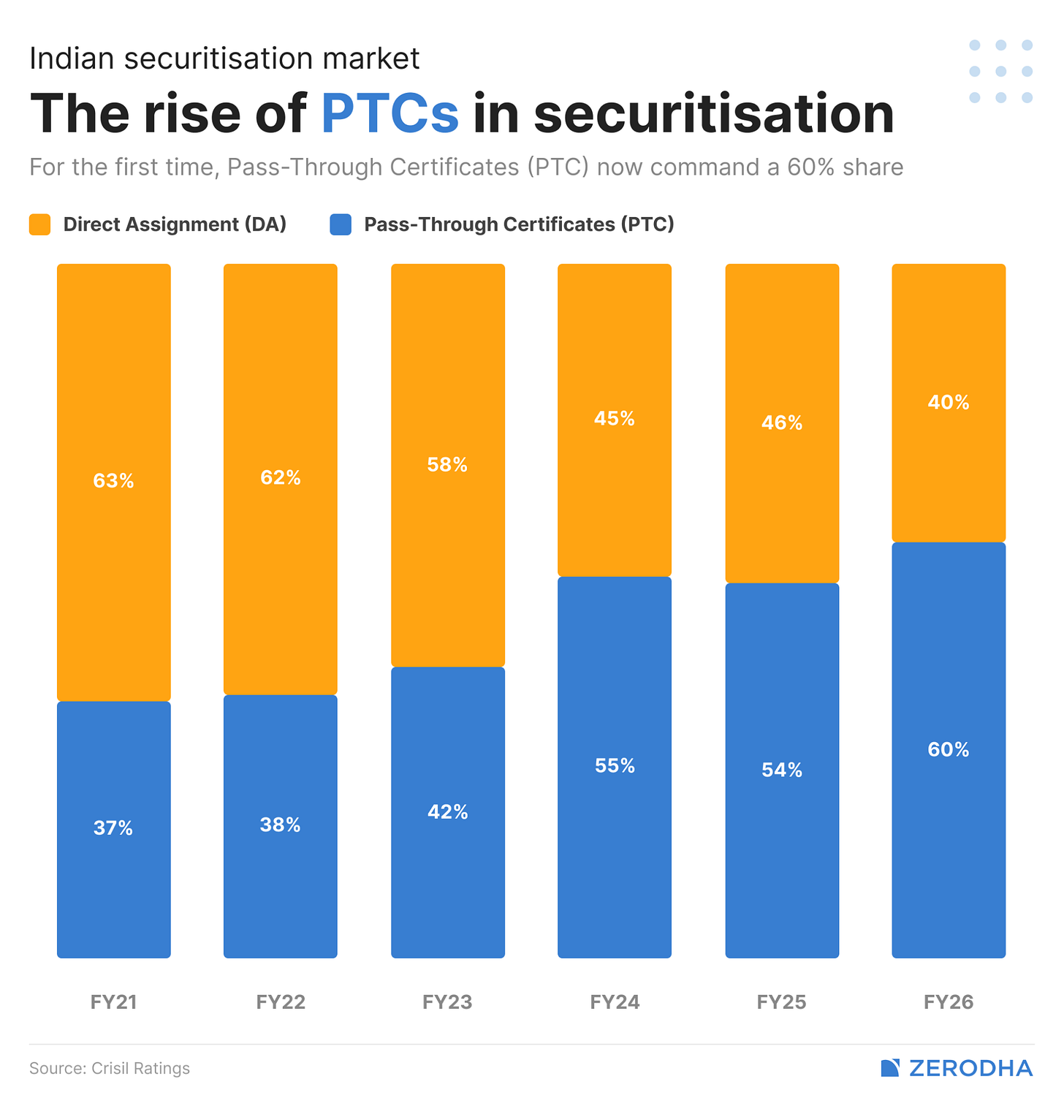 In FY26, PTCs accounted for roughly 60% of all securitisation transactions — an all-time high — and DAs made up the remaining 40%. We’ll come back to why PTCs are gaining ground.