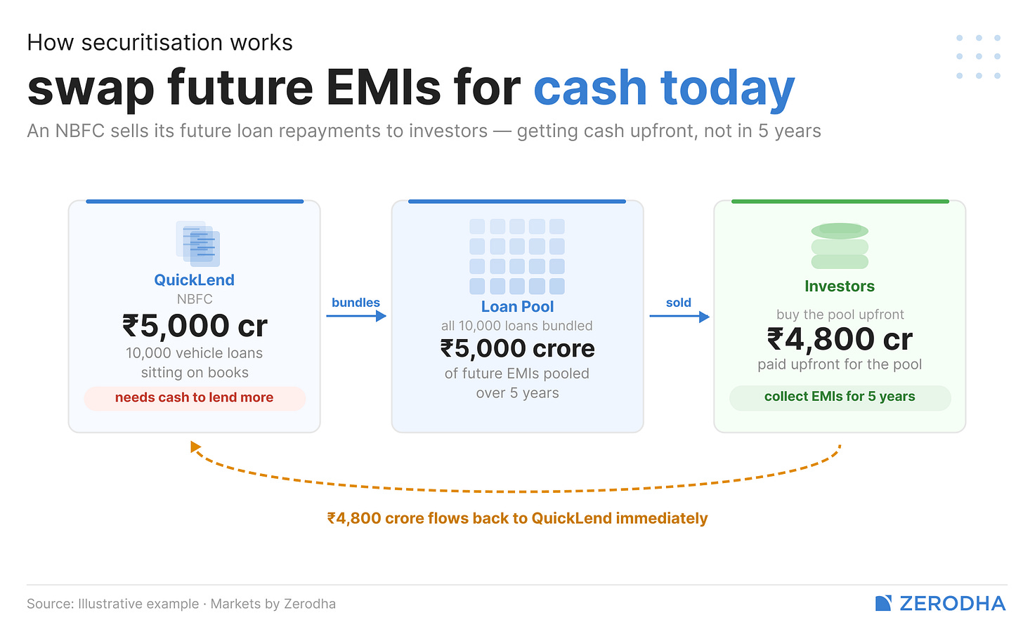 Say an NBFC — let’s call it QuickLend — has given out 10,000 vehicle loans, each worth about ₹5 lakh. That’s ₹500 crore of loans sitting on its books, each of which will be repaid through monthly EMIs over the next five years. QuickLend has an asset — the right to receive those future EMIs — but it doesn’t have cash today. And it needs cash today, because it wants to lend more.