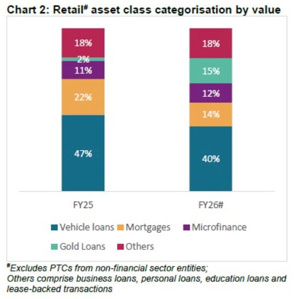 Second, gold loan securitisation came out of nowhere. In FY25, gold-loan-backed deals were barely a blip. But in FY26, they surged to 15% of the market, becoming the second-largest asset class behind vehicle loans. Gold loan disbursements had been rising sharply, up 94% year-on-year in Q3 FY26 alone, driven by rising gold prices and tighter unsecured lending norms.