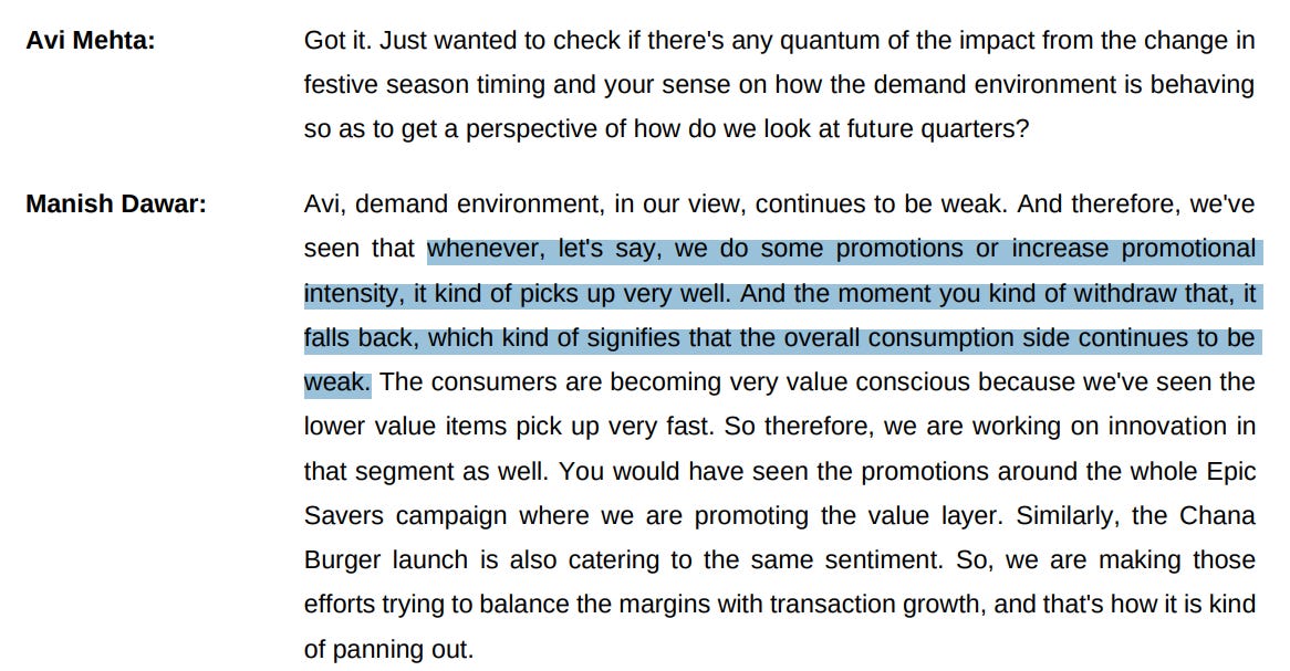 “Whenever, let’s say, we do some promotions or increase promotional intensity, it kind of picks up very well. And the moment you kind of withdraw that, it falls back…”