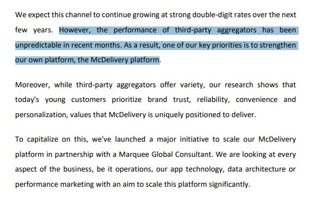Is there something that can pull McDonald’s out of its funk? For now, they’re betting on their in-house delivery service, “McDelivery” — hoping to double the platform in two years. Will this let them pull off Jubilant-like growth? We’ll check back in a few quarters from now.