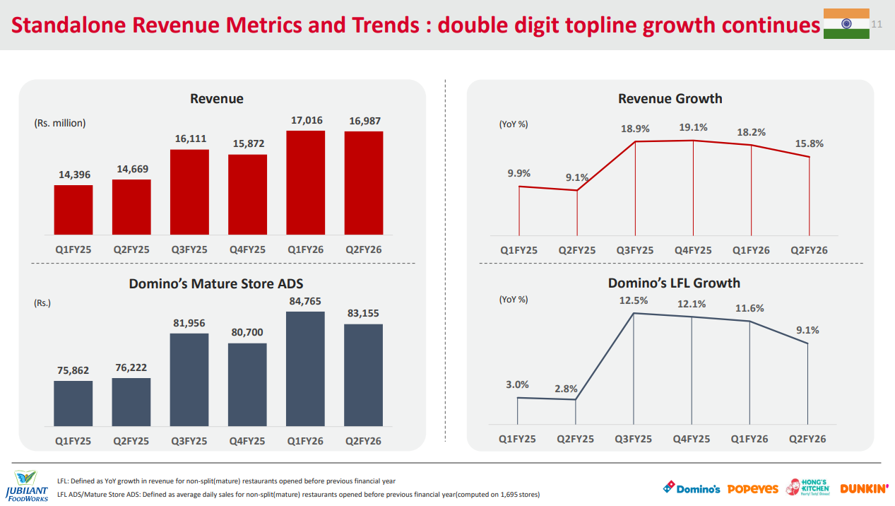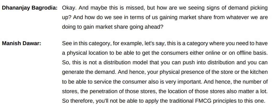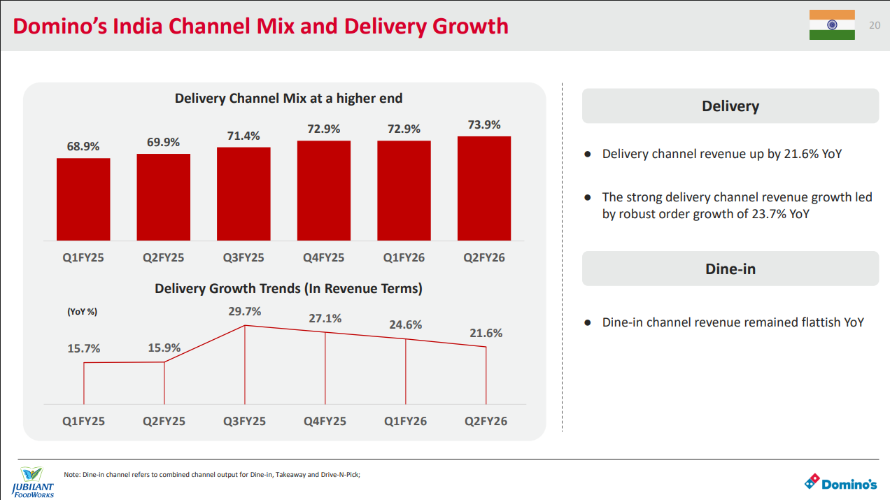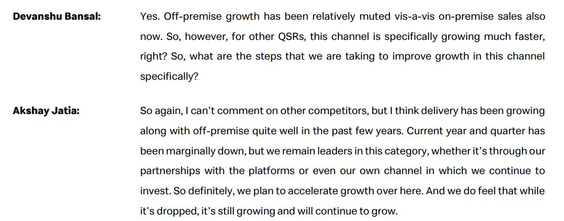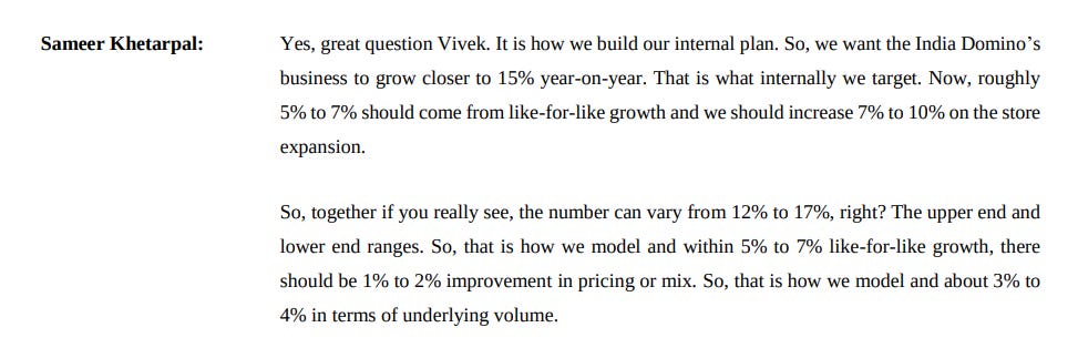 Perhaps it’s because this clear path has opened that, after months of refusing to give any guidance, the company finally set out a clear model: Domino’s India should grow about 15% a year, with 5–7% coming from like-for-like. That’s a major shift in its tone.