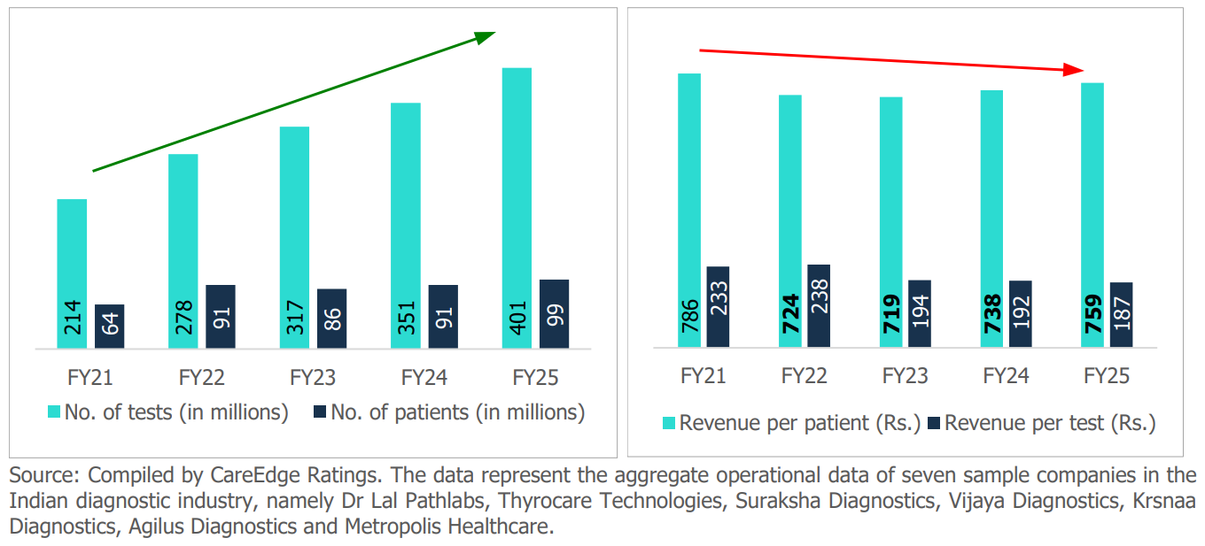 Instead, these companies are growing by carrying out an increasing number of tests on more and more patients. Even as prices fell between FY 2021 and FY 2025, the industry saw 12% CAGR in patient volumes and a 17% CAGR in the number of tests.