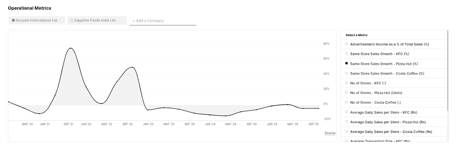 To be fair, Devyani still grew its revenues by 12.6% year-on-year. But most of that growth came because they opened new stores. The same stores, however, couldn’t draw more demand. The SSSG for both KFC and Pizza Hut was negative.
