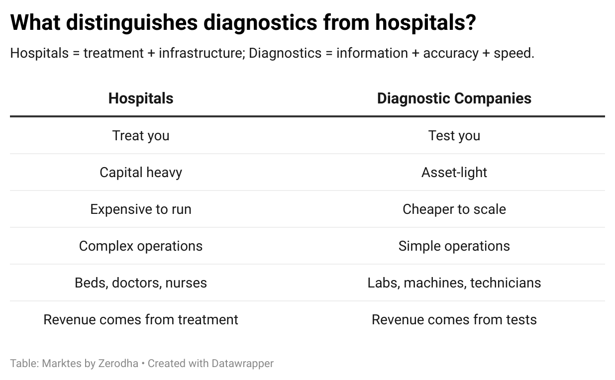 People often lump diagnostics into the same bucket as hospitals — but the two businesses couldn’t be more different. A diagnostic company doesn’t treat you. It doesn’t operate ICUs, admit patients, or perform surgeries. It has a single focus: running tests. Diagnostics companies trade in information.