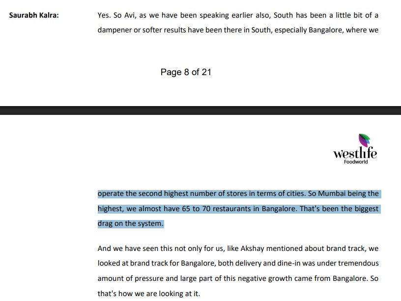 Westlife has 65–70 stores in Bengaluru — more than any city other than Mumbai. But Bangaloreans seem to have fallen out of love with the brand. According to the company, most of its negative growth came from Bengaluru alone, with both delivery and dine-in under “tremendous pressure”.