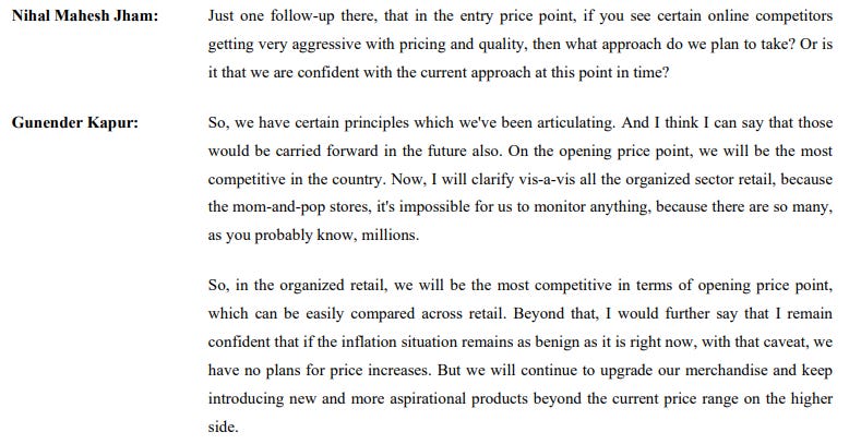 Zoom out of this quarter, and there are some looming existential questions that the industry must answer. This is a space that has the attention of giants, and competition is ramping up. Trent’s Zudio is making waves in the cheap fashion space. Reliance is making an aggressive entry with its own competing label, “Yousta”. Meanwhile, an online retailer like Meesho is selling T-shirts as cheap as ₹50–60 a piece.